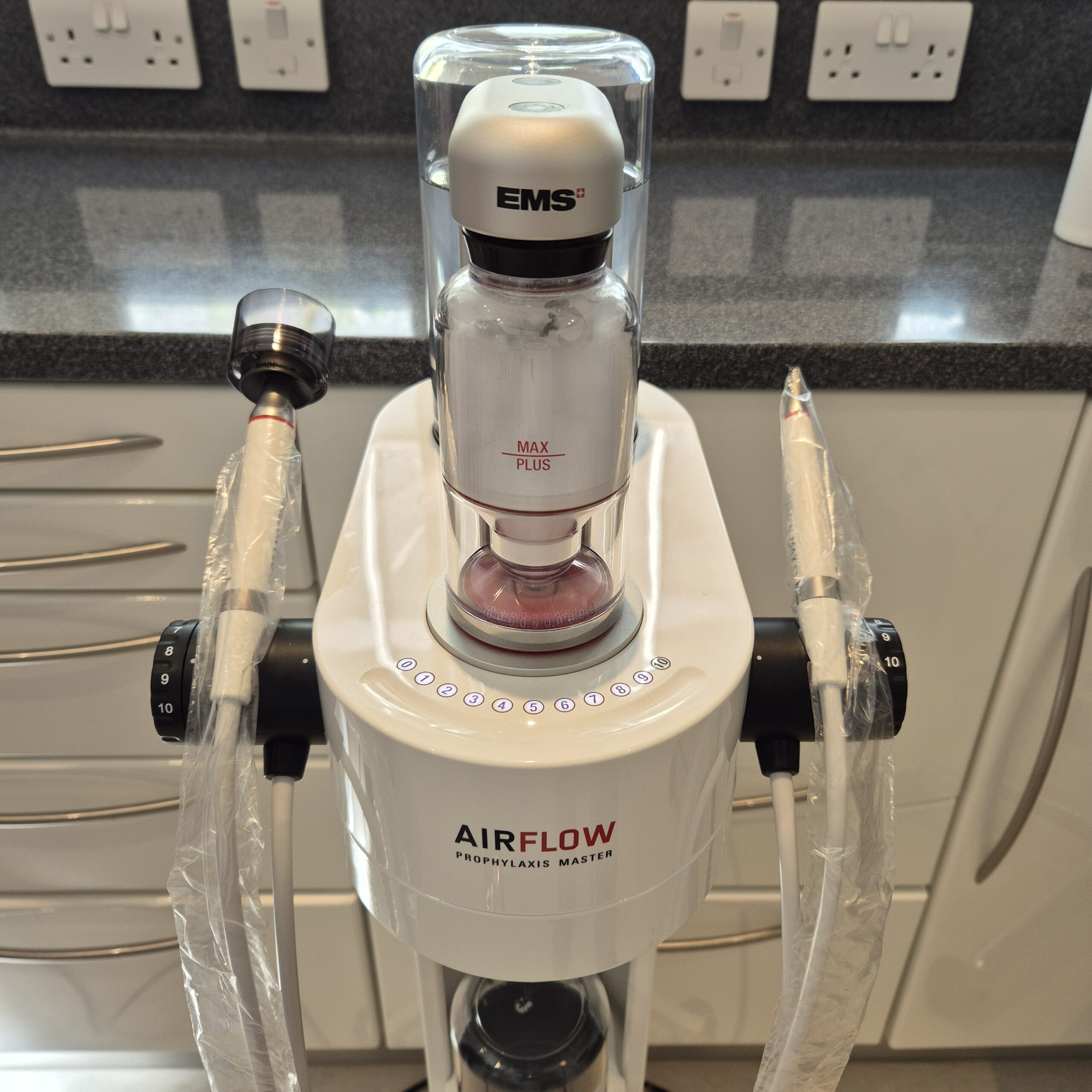 EMS Airflow treatment uses a high-powered spray to project water, bicarbonate, and compressed air onto the teeth, and clean away areas of plaque and gently remove yellow, brown, or grey stains. The spray technology ensures hard-to-reach areas can be accessed and treated effectively in a fast and non-invasive way.